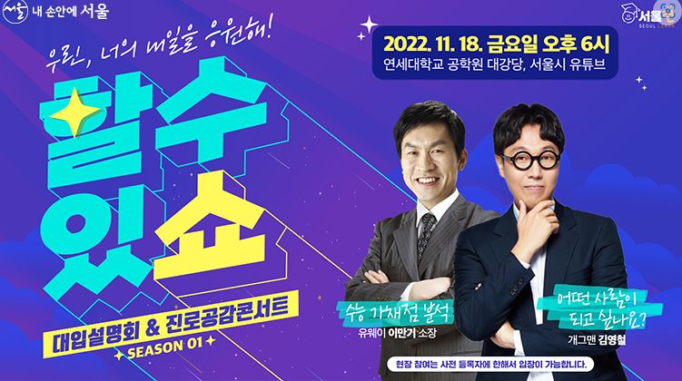 아래 바로가기 링크를 통해 온라인으로 무료 시청 가능합니다. 오프라인 참여 당첨되신 분들은 연세대 공학원 대강당에서 직접 보면 되고요. 유튜에서 볼 수 있으니 수험생 뿐만 아니라 학부모 등 누구나 이용할 수 있습니다.
