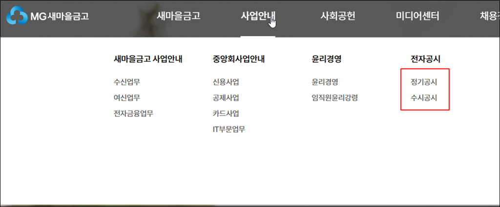 우선 MG새마을금고 공식 홈페이지(바로 가기)를 방문해주세요. 그리고 상단의 사업안내 > 정기공시 항목으로 들어가 금고명검색으로 우리 지점명을 검색해보세요. 그리고 하나씩 클릭하여 살펴보세요.