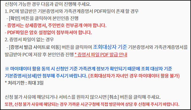 - 대리 신청일 경우 위임장 추가 필요 (대리인 신분증도 필요)