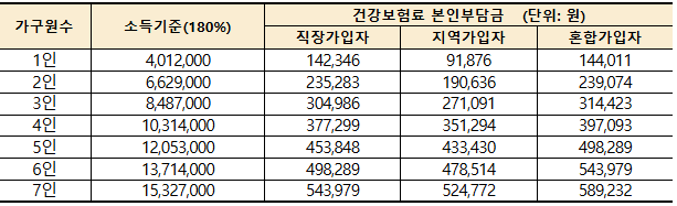 - 소득기준 : 가구 기준 중위소득 180% 이하인 경우, 아래 표 참고 (최근 3개월 평균 건강보험료 고지 금액 기준)