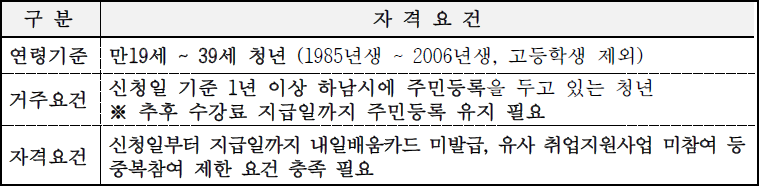 - 지원대상 : 신청일 기준, 1년 이상 하남시에 주민등록을 두고 있는 만 19세 ~ 만 39세 미취업 청년