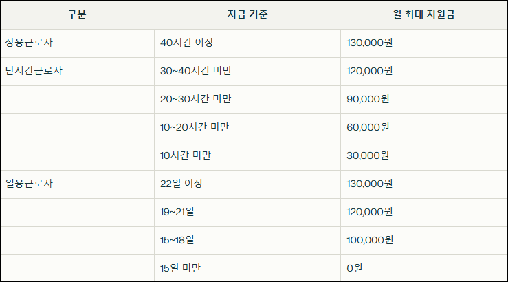 - 5인 미만 사업장인 경우 추가 지원(월 7만원 등)도 가능합니다.